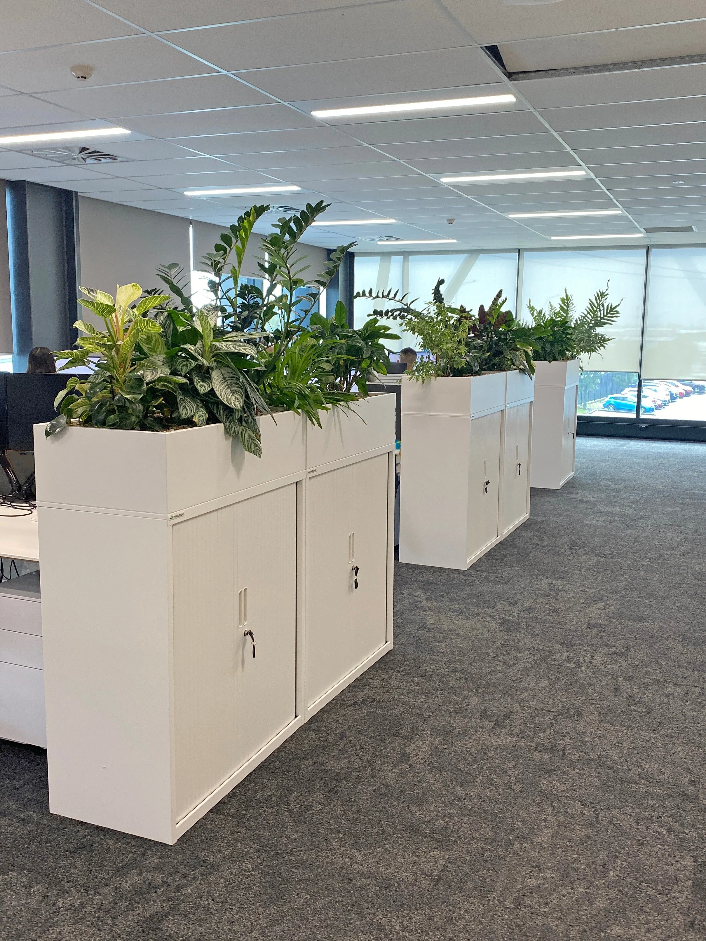 Tambours offer a clever solution for incorporating plants into office spaces by planting on traditional storage tambours. This innovative and space-saving option enhances workspaces by seamlessly integrating greenery into the office layout, beautifying the ubiquitous storage cabinet.